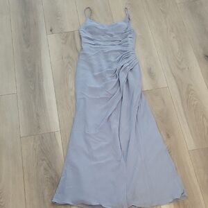 Chic light blue maxi dress by Azazie. Features delicate straps and elegant draping. Perfect for formal events.