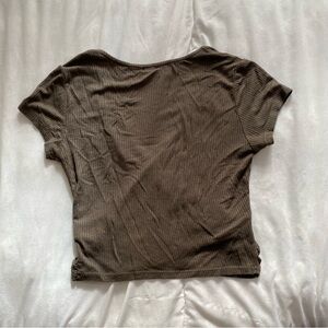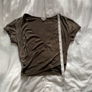 Very flattering cropped khaki wrap top from Garage. Features a deep V-neck and short sleeves.