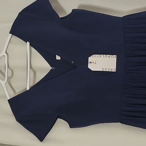 Chic dress with a flowing skirt. Features a flattering V-neckline and short sleeves. Perfect for elegant occasions.