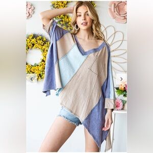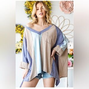 Oversized casual tee shirt in blue and beige from Olí & Hali. Features a sharkbite hemline, v-neck, 3/4 length dolman sleeves, outseam detailing and an oversized, boxy fit. Size small, PTP is 39, length in the center is 25, on the sides is 32 inches. Purchased new from a Poshmark boutique and never worn.