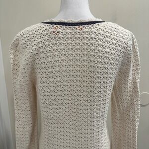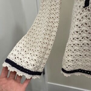 Tory Burch Ivory Crochet Knit Navy Trim V-Neck Tunic Large Resort Wear Preppy