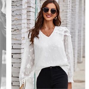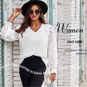 Chic white blouse with ruffled details. Perfect for stylish outings. Grace Karin Elegant White Long Sleeve Blouse with Ruffle Details