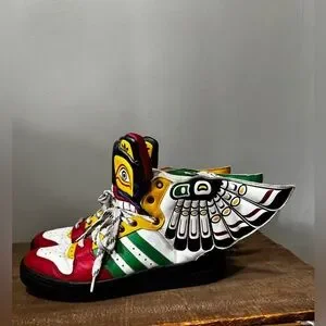 One of Jeremy Scott’s most iconic and collectible Adidas collaborations — featuring the bold totem face tongue and detailed wing panels inspired by Pacific Northwest tribal art. These are true statement sneakers and hard to find, especially in wearable condition.