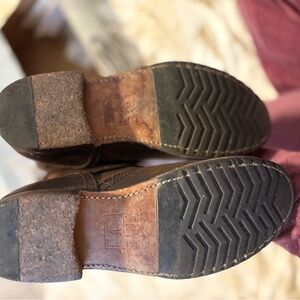 Elegant knee-high boots. Rich brown leather. Some wear, Timeless style.