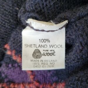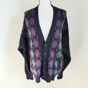 Shannon Traders 100% pure new wool argyle cardigan sweater. Made in Ireland. Size XL. Colors are navy blue, green, purple, and red. Measurements are as follows: length from back neck seam to back bottom hem: 29"; pit to pit: 27"; arm from shoulder seam to end of cuff: 28."