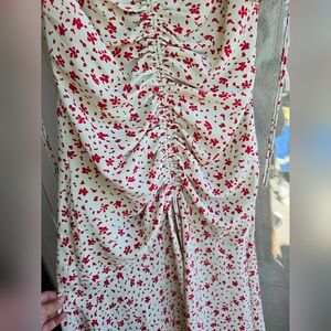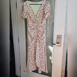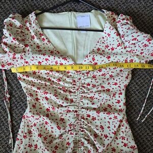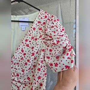 This elegant Sundress by C/MEO Collective features a charming red and cream floral pattern, perfect for a wedding guest occasion. The dress showcases a flattering v-neckline and short puff sleeves, adding a touch of sophistication to its high-low design. Cameo Collective Interest Midi Dress