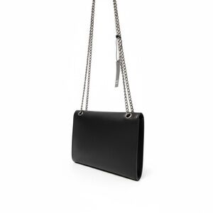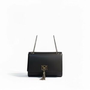 Make an entrance with this striking Badgley Mischka shoulder bag — crafted in smooth black vegan leather and finished with bold gunmetal chain hardware. The signature BM logo clasp and tassel accent bring instant glam, while the versatile chain strap lets you style it as a chic shoulder or crossbody bag. Perfect for cocktails, date nights, or adding high-glam polish to your everyday look.