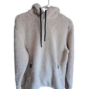 Plush cream sherpa hoodie with black accents. Ideal for cozy comfort. Pit to Pit approx 14". Shoulder to hem approx 25"
