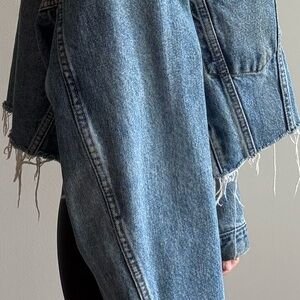 Classic Levi's denim jean jacket size large cropped frayed edge hem vintage trend Canadian tuxedo distressed denim on denim. I’m typically a s/m great relaxed oversized fit