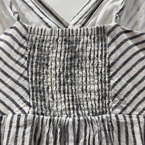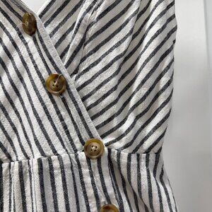 This dress is made of a linen-rayon blend with a black and white stripe pattern, with a white 100% rayon lining. Perfect for hot weather or a trip to the beach!