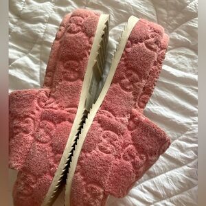 Soft blush pink slippers with embossed Gucci logo. Ideal for comfort and style.