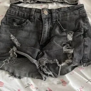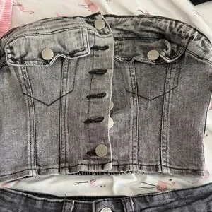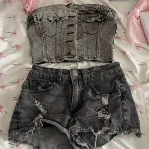 Stylish gray denim bustier with matching distressed shorts. Perfect for casual outings.