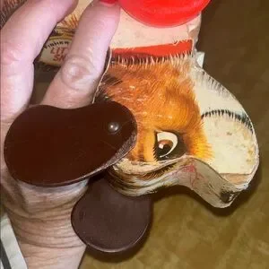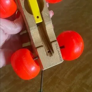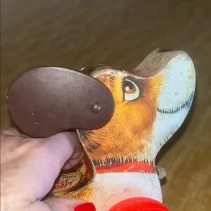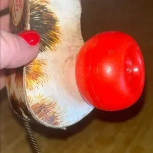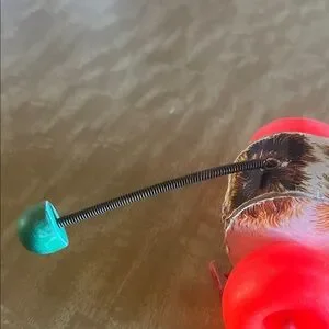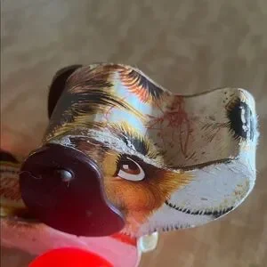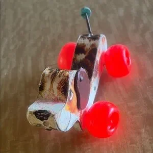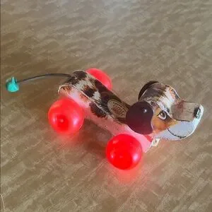 Charming pull-along dog toy with bright wheels. Encourages fun and movement. In preowned and marked on condition. Pull string is missing, some of the paper is also missing. Please see all pictures for reference of condition over all.
