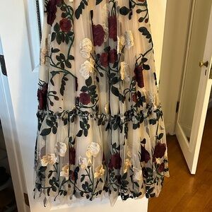 Charming maxi dress with bold floral embroidery. Features puff sleeves and ruffled hem. Ideal for elegant events.