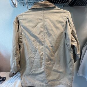 Stylish tan jacket with corduroy collar. Features button closure and front pockets. One broken button at the bottom, but it look like there is an extra sewn inside the jacket.