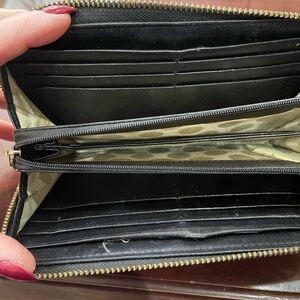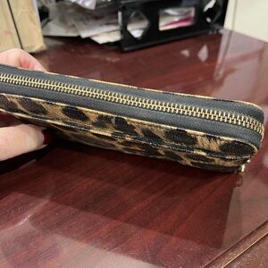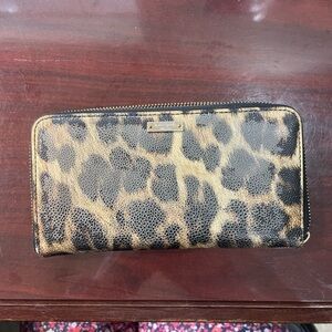 Stylish leopard print 8” wallet. Features zip-around closure. Iconic Kate Spade leopard print design. Holds 12 credit cards, zippered change holder in middle, and 2 inside sides to hold dollar bills. Another storage on one side on outside of wallet. Gentle wear and tear as this was used for years. Also missing the Kate Spade small charm on zipper.