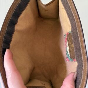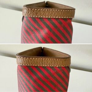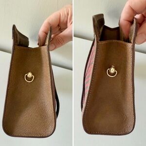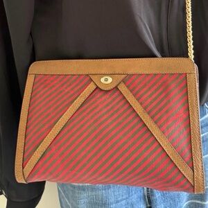 Stylish Gucci bag with red and green stripes. Brown leather trim. Ideal for fashion-forward looks.