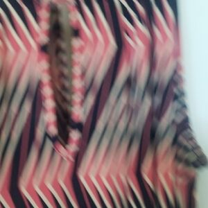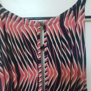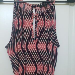 This stunning dress from Banana Republic showcases a sleeveless design with a chic halter neckline, perfect for casual or resort wear. The vibrant coral and navy wavy pattern creates a dynamic visual effect, making it a standout piece. Its stretchy fabric ensure both comfort and style for any relaxed occasion.