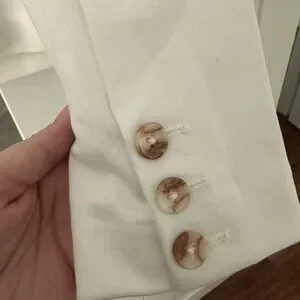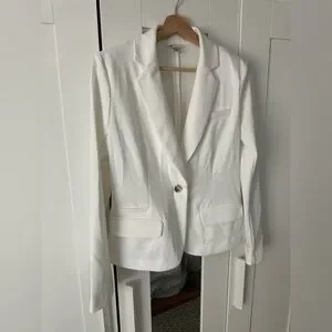 Chic white blazer with a single button closure. Tailored fit with front pockets. Ideal for professional or casual wear.