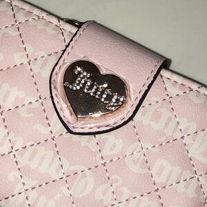 Quilted powder blush faux leather tab card wallet features Juicy Couture in white graphic print on front & back of wallet. Quilted diamond pattern on front & back of wallet. Powder blush faux leather strap with gold tone heart with Juicy on heart, Juicy with clear crystal accents. Strap with snap closure. Inside wallet clear ID window, slip pocket, card slots and zip pocket with pink faux leather accent for zipper pull. Fell in Love With Couture in gold tone foil detailing inside wallet. White & black lining with Juicy Couture in graphic print. Attached to bottom of wallet a gold tone open frame heart shaped key ring. Dimensions approximately 5” inches wide and 3.25” inches high. Made in Vietnam.