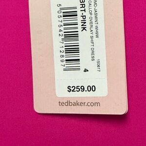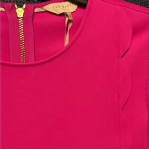 NWT Ted Baker fucsha scalloped overlay shift dress sz 4/10. The cloth tags says sz 4 but in Ted Baker measurements it’s a 10 (see tag photo). The dress is sleeveless, has an attractive scallop ridge down the left side, and a 22” long gold zipper closure.