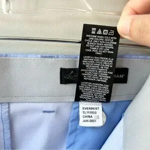 Features button/zip fly, elastic waistband, two side slash pockets, two back pockets, belt loops.