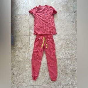 Stylish coral pink scrub set by Figs. Includes top and pants. Features yellow drawstring accents.