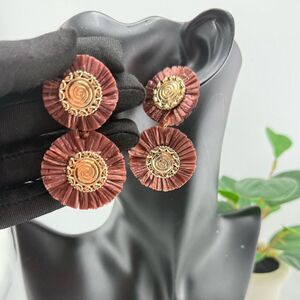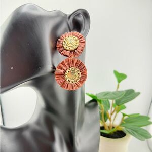 Turn heads with these earthy, bold, and beautifully handcrafted earrings. Featuring two layered discs in a rich terracotta hue with intricate spiral gold-tone accents, these earrings bring texture, movement, and a warm boho vibe to any outfit.