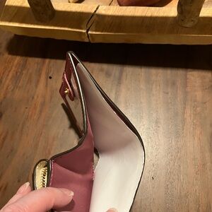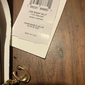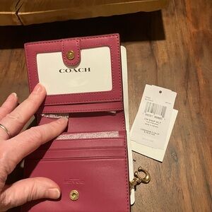 Stylish Coach wallet. Features iconic logo pattern. Compact and elegant design.