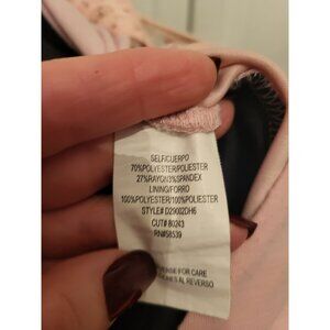 Pink and gray babydoll dress by Speechless is made from a poly/rayon/spandex blend. Dress features faux wrap styling that is stitched together for modesty, empire waist, sash, and pink lace shoulders and back.