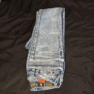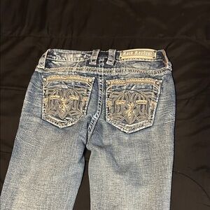 Faded blue jeans with detailed stitching. Features button closure and belt loops. Only worn a few times.