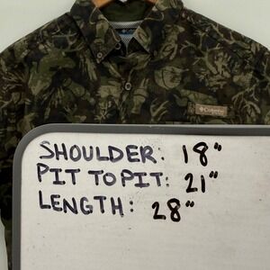 Keywords: Columbia Sportswear, PHG, hunting apparel, fishing shirt, camo print, outdoor wear, short sleeve, button down, performance gear, breathable, utility pocket, woodland camouflage