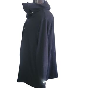 Stylish black asymmetrical wrap cardigan sweater by Nola. Has a high neck design with snap button closure at neckline.