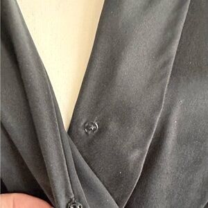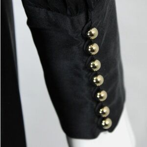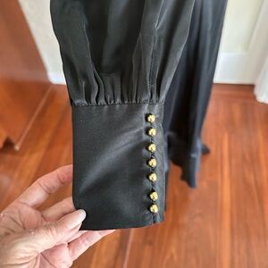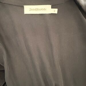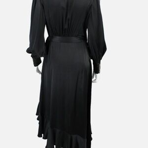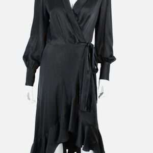 This is a midi dress by Zimmermann. This dress has a V-neck and a ruffled hem. It has long bishop sleeves with gold buttons and it is a wrap style with a tie closure. This dress is a brand size 2, which is equivalent to a United States size 8. It is composed of black silk woven fabric and is not lined.