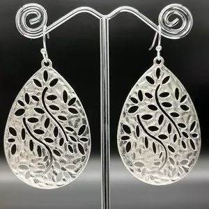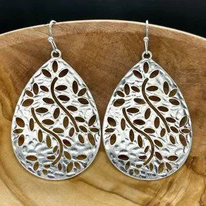 These silver tone teardrop earrings feature a delicate open cut floral vine design with textured detailing throughout. The intricate leaf pattern creates a soft, elegant look while the lightweight design makes them comfortable for all-day wear.