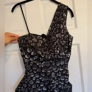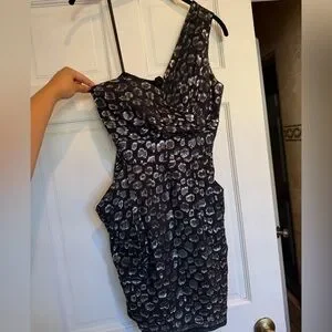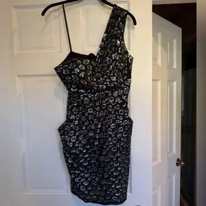Stylish one-shoulder dress with a striking black and silver pattern. Has pockets and built in padding.
