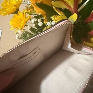 Elegant blush pink clutch with wristlet strap. Perfect for adding a touch of sophistication.