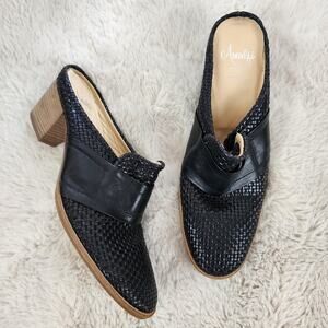 Amalfi by Rangoni, Woven Leather Mules, Made in Italy, Italian Leather Shoes, Black Heeled Mules, Block Heel, Almond Toe, Vintage Designer, Quiet Luxury, Office Shoes, Professional Heels, Luxury Slip Ons, Chunky Heel.