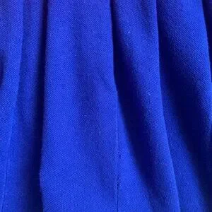 Beautiful peach-pink top with a blue pleated skirt and matching collar.