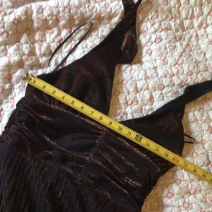 This dress starts with a tie halter bus line. Under the bust is a ruched area. Then the skirt falls in fuller knife plates to the Bubble hem . The skirt is marked as a 10 but please see measurements I believe it would be better suited to an eight and will list accordingly. In excellent condition except see you last two photos there is a catch in the back that catches the light it’s a teensiest flawLike a run in the nylon about 3 inches to the left of the zipper at the hip. I don’t believe it affects a look at the dress but you may