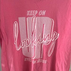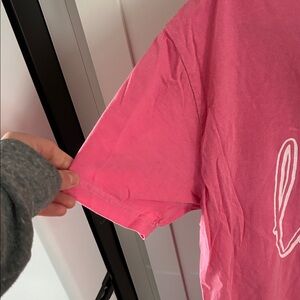 Bright pink tee with bold graphic text. Soft and comfortable fabric.