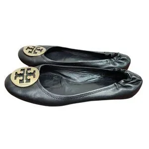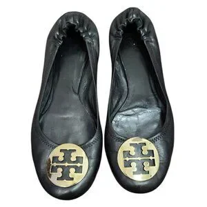 Tory Burch Reva Black Leather Ballet Flats Gold Logo Medallion Size 11