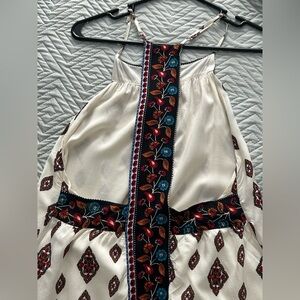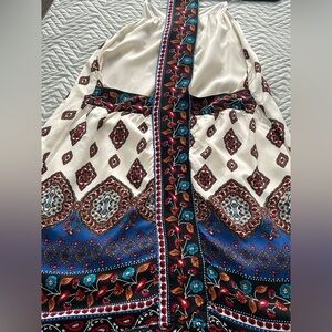 Chic and breezy bohemian-style halter dress by Sole Mio, featuring an elegant floral and geometric print in ivory, navy blue, and wine tones. Designed with a unique wide floral back strap and a flattering above-the-knee length, perfect for warm days or sunset strolls.