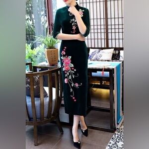 Elegant green velvet Cheongsam dress featuring beautiful pink floral embroidery. Perfect for special occasions. Brand new.