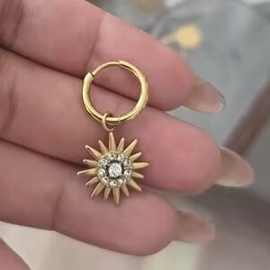 Elegant gold sunburst hoop earrings with sparkling accents. Perfect for adding a touch of glamour to any outfit.