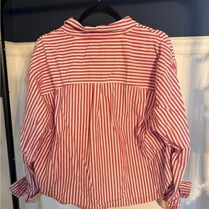Stylish red striped button-down shirt with a cropped hem. Breathable natural fiber fabrication.