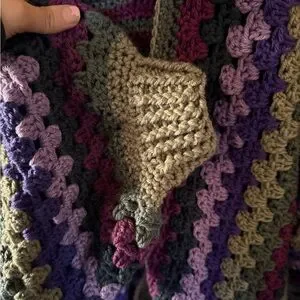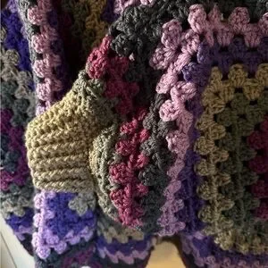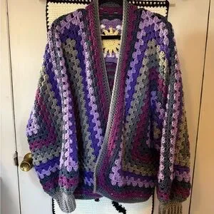Embrace vibrant style with this colorful crochet patchwork sweater. Featuring a mix of purple, gray, and yellow, this sweater adds a unique touch to any wardrobe. Perfect for cozy days and making a statement.