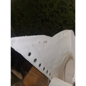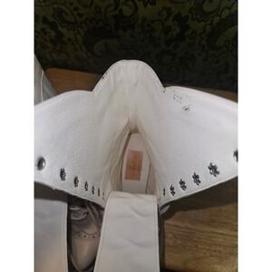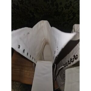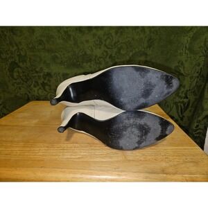 Vintage-inspired Victorian lace-up boots crafted from supple cream leather. These mid-calf boots feature a distinctive pointed collar and intricate brogue wingtip detailing with perforated accents. The front lace-up closure is complemented by speed hooks for a secure fit, while the kitten heel and pointed toe create a sophisticated silhouette. Perfect for adding a touch of steampunk or cottagecore elegance to any ensemble. SIZE IS APPROXIMATE NO SIZE LISTED. MY DAUGHTER IS A SIZE 5 & THEY FIT HER