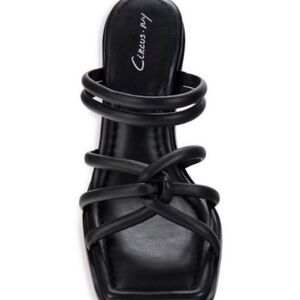 These chic sandals are highlighted with strappy upper and set on self-covered flared heels. Synthetic upper Open toe Slip-on Lining: Synthetic Padded insole Synthetic sole Self-covered flared heel, 3.75"