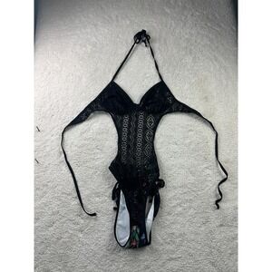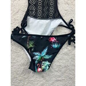 One Piece Swimsuit Womens Medium Black Lace Crochet Monokini Flamingo Print Tropical